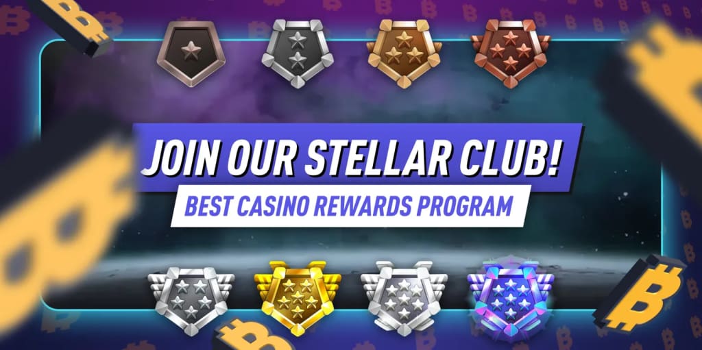 The Stellar Club is mBit’s loyalty engine. You start at Space Trooper. You climb to Space General. You earn Stellar Points to set your level. You earn Bitty Coins to exchange for bonuses. Levels bring higher money-back rates, bigger weekly matches, more wheel spins, and VIP-style treatment.