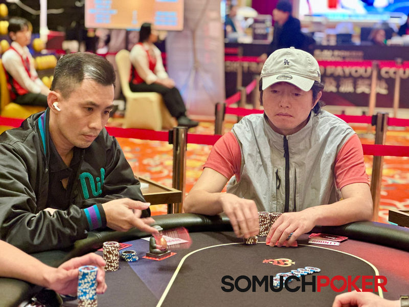 Wang picked up the lead with ace-high against Wu's king-high; however, Wu prevailed on the 7 7 Q flop, improving him to trip sevens and leaving Wang drawing thin.
